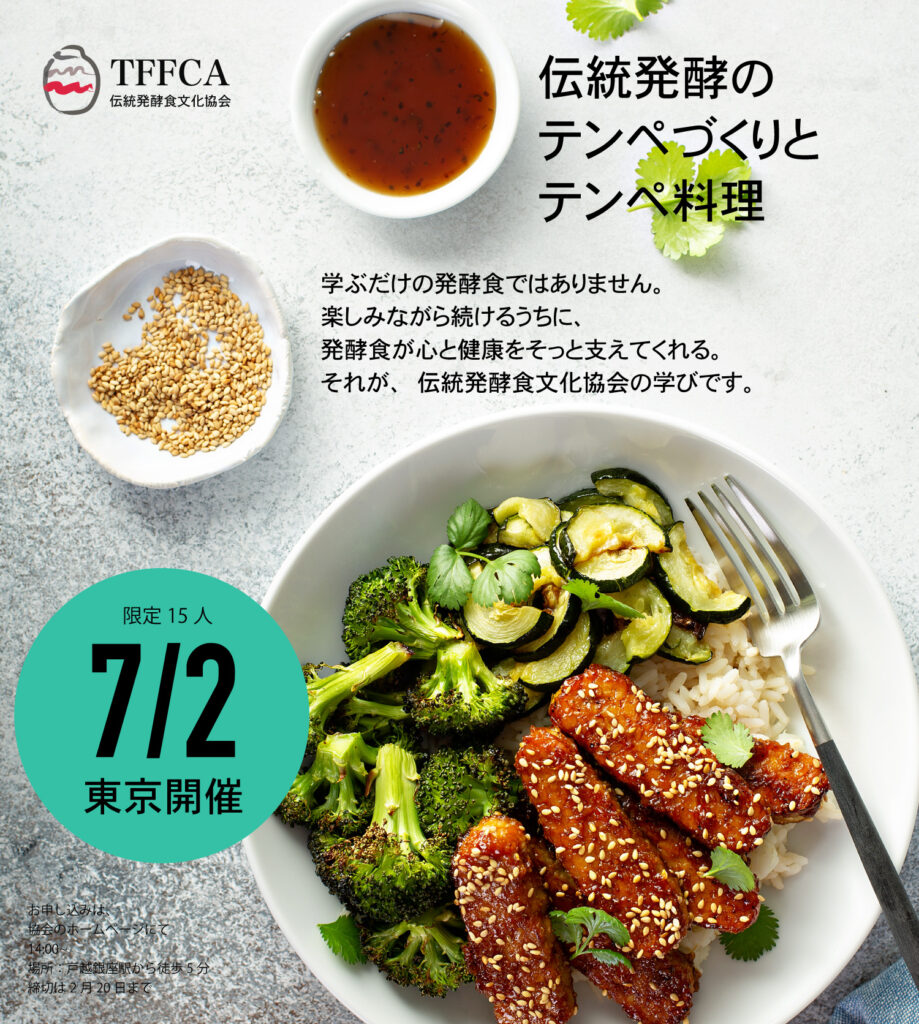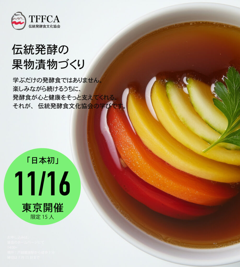 発酵の仙人16 1月, 20260 Comments0 Secs Read2026年度伝統発酵実践講座 2/16 宮廷キムチづくり 3/16 発酵アップルバター 4/13 発酵林檎コチュジャン 6/15 梨花の米ヨーグルト 7/2 テンペ&テンペ料理 9/14 旨み調味料(日本初) 10/7 天然湯浅醤油(日本初) 11/16 果物漬物(日本初) 12/1 発酵味噌(日本初) 日本の食文化の原点である伝統発酵食と伝統発酵調味料。その“本質”を、知識だけでなく手を動かし、五感で理解するそんな学びができるのは、日本で唯一、伝統発酵食文化協会だけです。本講座には、他では一切学ぶことのできない日本唯一の講座内容を含み、すべてが実践中心。「知る」だけで終わらせず、日々の暮らしと食卓に生かせる力を身につけていただきます。これほど濃密で本質的な内容を、どなたでも参加しやすい特別価格でご用意しました。ここで学べる知識と技術のほとんどは、#伝統発酵食文化協会 でしか学べないものです。 少人数制・定員15名限定。15名に達し次第、受付は終了となります。日程は確定しておりますが、参加者様や主催者のやむを得ない事情により、変更となる場合がございます。あらかじめご了承くださいますようお願いいたします。場所は、戸越銀座駅から徒歩5分 準備物:エプロン、筆記道具、お持ち帰りがありますので紙バッグ お申し込みはこちら 年間まとめて申し込む(お得) お知らせイベント&講演会Share: 食の正しいメカニズムサイトリニューアル
